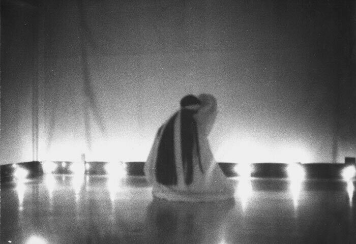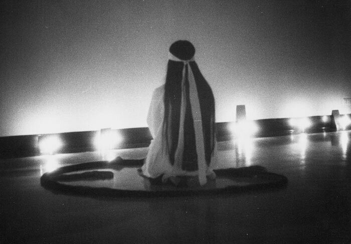 While Cha was a student at Berkeley, she worked in many mediums, including video and performance. These photographs document A Ble Wail from 1975, performed at Worth Ryder Gallery. Cha constructed a space with mirrors, candles, and curtains made of cheesecloth, through which she moved wearing a white robe and over twenty meters of black and red cloth. In the accompanying text, she wrote, “In this piece, I want to be the dream of the audience.” Photo: Trip Callaghan. Courtesy the University of California, Berkeley Art Museum and Pacific Film Archive