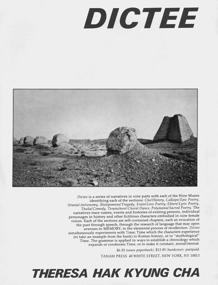 A 1981 broadside announcing the first publication of Dictee by Theresa Hak Kyung Cha from Tanam Press. Courtesy the University of California, Berkeley Art Museum and Pacific Film Archive