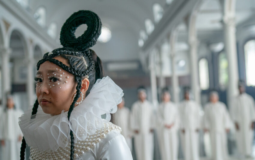 The infinitely coolJobu Tupaki, hair braided in a dark ouroboros, pearls dripping from her eyes, clad in a shimmeringly ruffled and anachronistic white gown like some cosmic popess, the sum total of all the multiverse’s versions of herself—angry, gleeful, vicious, suicidal, sad, everything, everywhere, all at once—beckons us toward the dark hole in space and time, sucking all of existence into its nihilistic, multitudinous embrace: A bagel. An everything bagel.