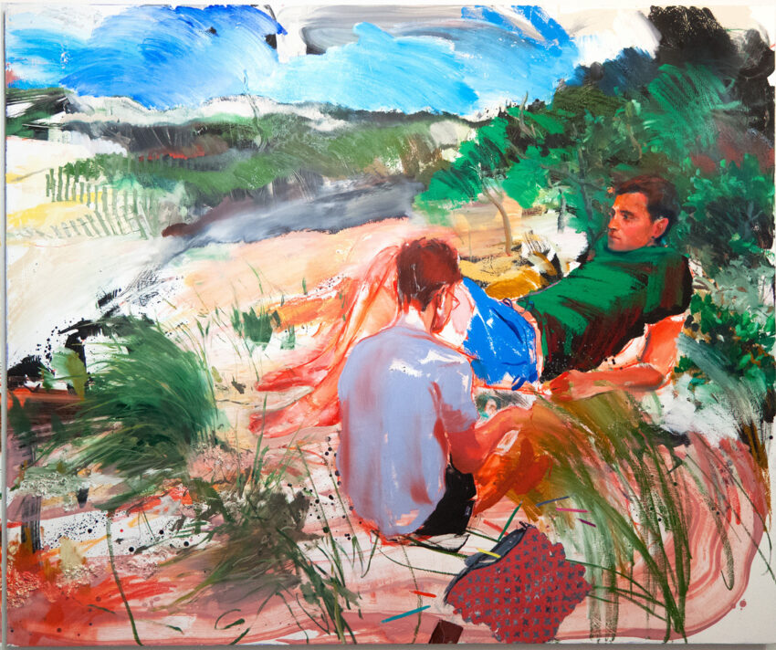 Doron Langberg, Drawing Mike (panel #1), 2020, oil and color pencil on linen diptych, 80 x 96 in. Courtesy the artist and Victoria Miro