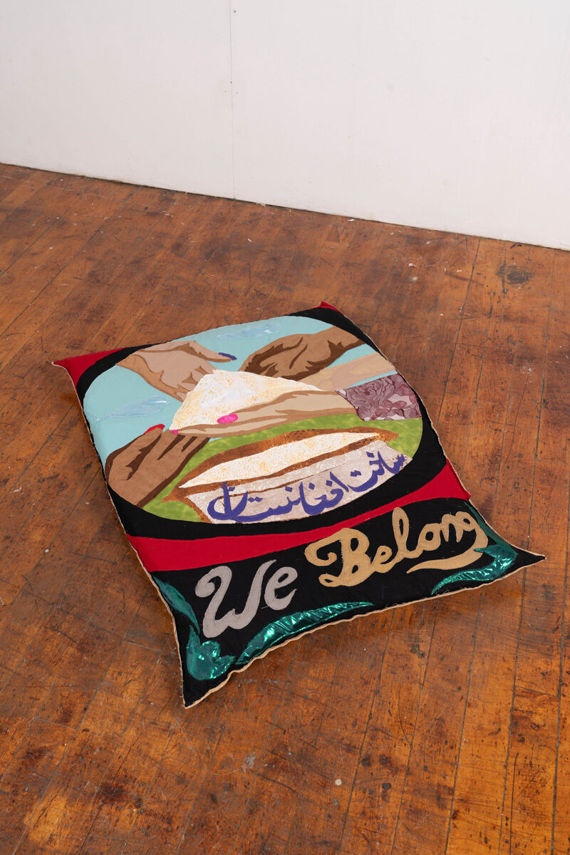Amiri, whose family fled Taliban-ruled Kabul in 1996 and who now lives in the United States, says her work explores the nature of memory after migration and reflects her wish “to continuously paint the untold stories of Afghan women.” A painter by training, Amiri quilts together vibrant fabrics into large-scale, often wall-sized, pieces. She sources many of her textiles from the Afghani-owned shop A. K. Fabric in New York City’s Garment District and collects others on her travels and from her friends. According to Amiri, the variety of these fabrics—and the complexity of their origins—“resonates with how I think about my identity as a fragmented body or geography that connects me to a world of in-betweenness.”