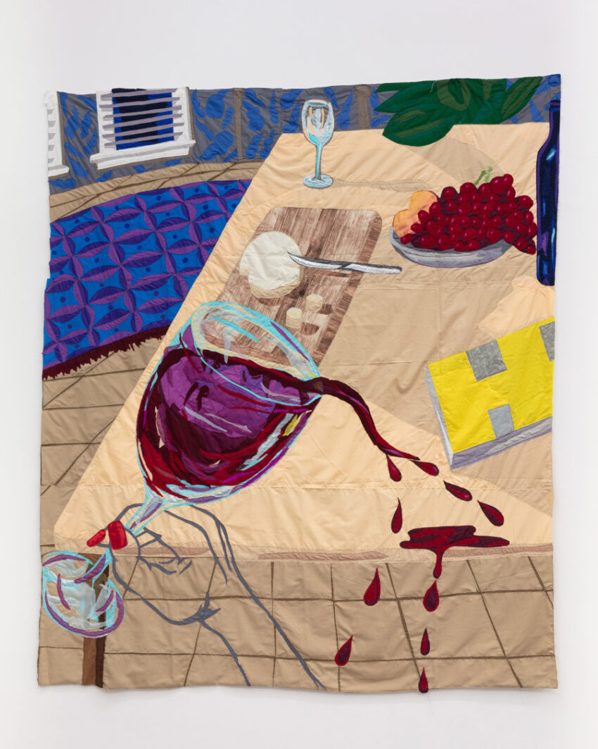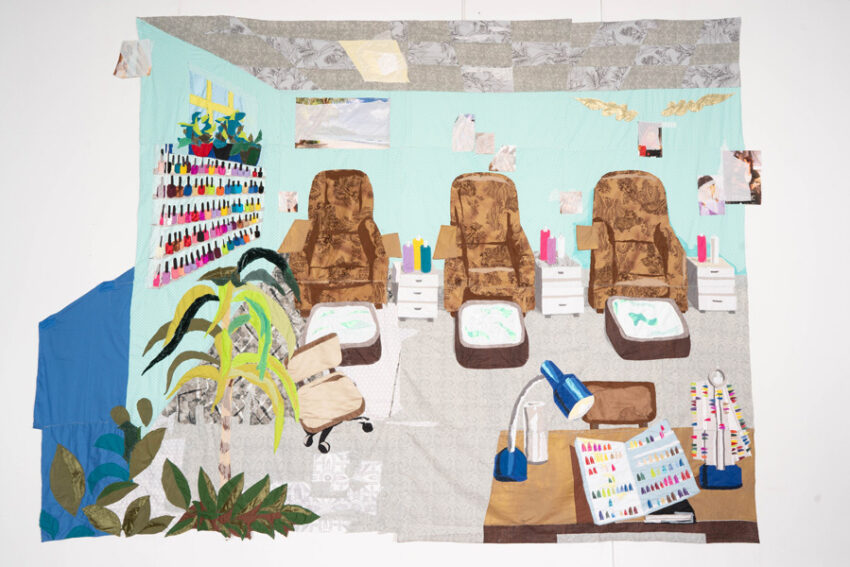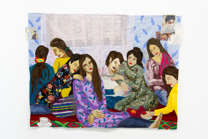 the afghan-born artist Hangama Amiri’s vivid, painterly tapestries explore notions of gender, community, and the essence of home. In her work, the most quotidian places and objects—a nail salon, a vanity, a kitchen table—become sites of cultural remembrance and fellowship among women.