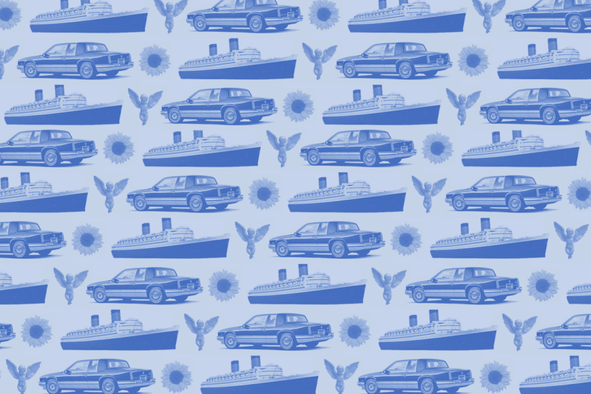 when i was eight years old, I went on my first trip to Europe. In a small cabin on the ocean liner Queen Elizabeth 2, my mother upended our suitcase, gazing at the confetti of clothes on the bed. She tossed a blue dress over my head, cinching it with a monochrome polka-dot belt. She tied a silk scarf to my body; abstractions brightened my skirt. She stacked bracelets from wrist to elbow, adorning me like a stage star from her vintage postcard collection. Shells, pearls, and beads cascaded down my chest. Then she grabbed a sewing kit and stitched sample perfume bottles around the brim of a beach hat. She placed it on my head along with a lei, a relic of a past trip to Hawaii. I shifted in boredom, staring at the TV screen that seemed to live-stream the ocean into our windowless cabin. I protested a smear of lipstick. Finally, she safety-pinned a pack of Merit Ultra Lights to my chest, found a marker, and scratched nothing to declare in giant letters on the back of a ship announcement. She attached the sign to my back.