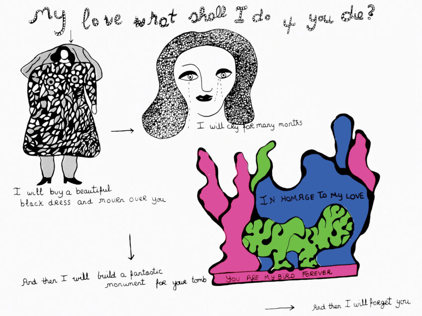 Saint Phalle left behind two memoirs of her early life and a vast trove of drawings, prints, writings, letters, poems, books, and sketches that respond to or comment upon her life and thoughts. An artwork, for Saint Phalle, was not an object but an act—ritual, performance, public, revelatory of her personal life. Art gave her wholeness. It gave her the ability to talk about loss and pain, mistakes and successes, collaboration and creativity. It gave her the ability to talk about joy. “I bring to LIFE my desires my feelings my contradictions longing forgotten memories shadows—visions from some other place,” she writes on a sketch. The duality of this statement, of “bringing to life,” is an apt summation of the overlap of Saint Phalle’s life and art: both a bringing into existence and a bringing to bear. These are visions from the frontiers of consciousness. In living, she gave these sensations form. In her art, she gave them life.