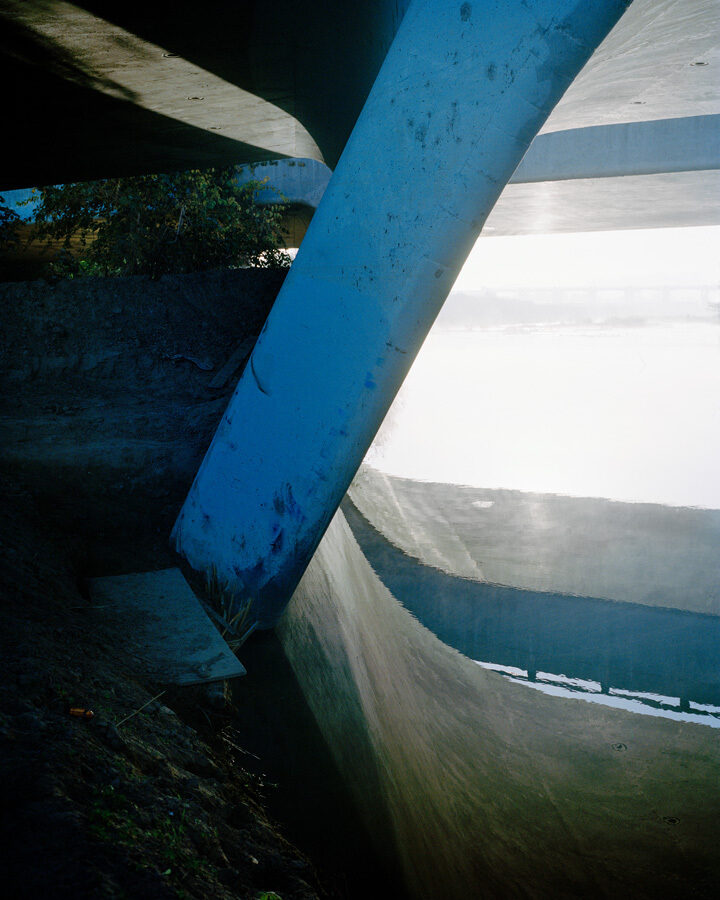 Channel, the project from which this folio is drawn, considers the site of the Los Angeles River, describing a place where nature has become preternatural. The natural river is a cyclical body of water, surging with snowmelt and late-winter rain, that forms in the San Fernando Valley. Its alluvial plain shaped the land over which Los Angeles now sprawls. Its counterpart is a concrete river built by engineers beginning in 1938 after a series of devastating floods. The flowing river is perennial and elemental, charting geological time. The constructed river is vulnerable and finite, a fossil of the future.