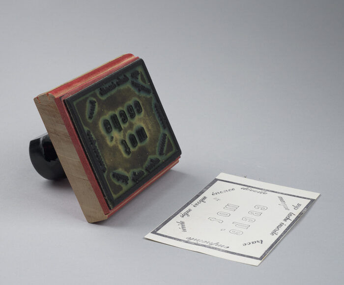 After the stamp is applied to paper, the outer circle of words becomes legible. The words in the middle, however, hide themselves again. (They now say tom éhcac.) So the “correct expression,” at least in this mode and direction of reading, stays behind, on the stamp, elsewhere. The words of inscription wrap around the hidden word(s) like a glove, within which: a center that doesn’t send.