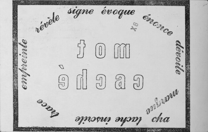 In 1978, theresa hak kyung cha made a stamp—a rubber stamp, not a postage stamp—for a small exhibition in Amsterdam. Cha, whose "mail art," writing, and performances explore patterns of public circulation, mistranslation, and exchange, made the stamp to fit on a standard postcard. At the stamp's center are two words, outlined in black: mot caché (French for "hidden word"). Arranged in an oval around them are other French words, in mirror image—empreinte révèle signe évoque énonce dévoile marque tache inscrite trace—all of which relate to the act of inscription.