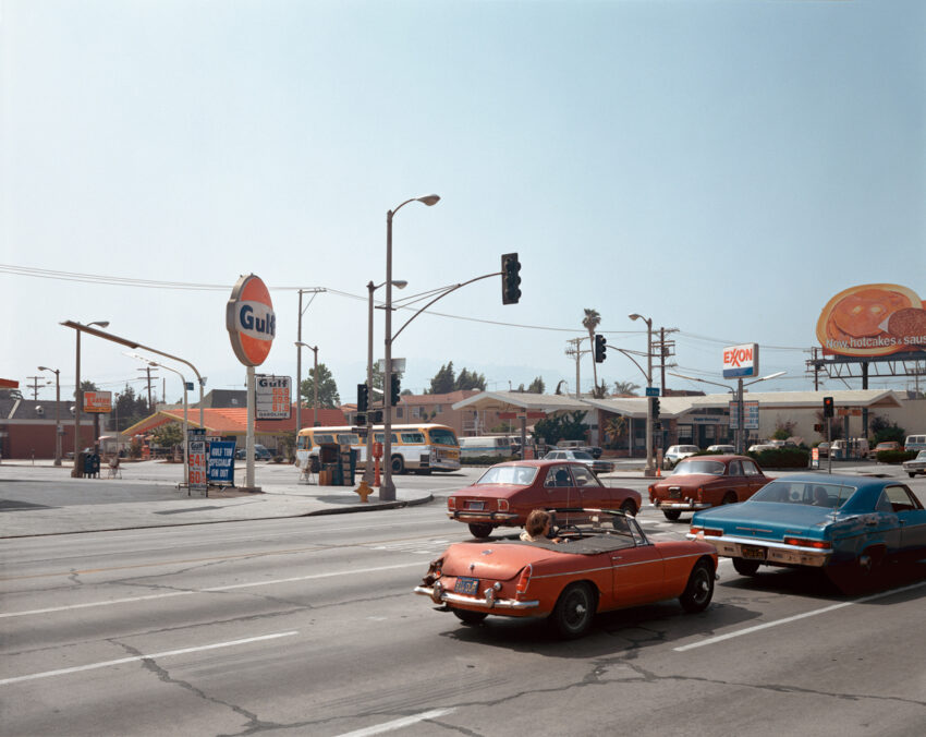 June 21 that year was a Saturday; Shore returned the next day to take another picture of the same corner. On Sunday, he tilted his view to the west and shot the southwest and northwest corners, even while retaining the same pattern of traffic heading north on La Brea. Seven years later, in Uncommon Places, Shore would include this second photo alongside the other, with the title Beverly Boulevard and La Brea Avenue, Los Angeles, California, June 22, 1975. The complemental June 22 photograph allows something closer to a panorama of the intersection but does not trouble the basic impression of the scene. A gas station presides over the first image: a Chevron/Standard, with its precise horizontal sign creating a counterpoint to the verticality of the adjacent streetlamp pole and floating above the white canopy, which points diagonally toward Beverly. Directly across the boulevard is a second gas station, a Texaco. In Shore’s second photograph, a continuity: we can see that the other two corners are also occupied by gas stations, Gulf on the southwest and Exxon on the northwest.