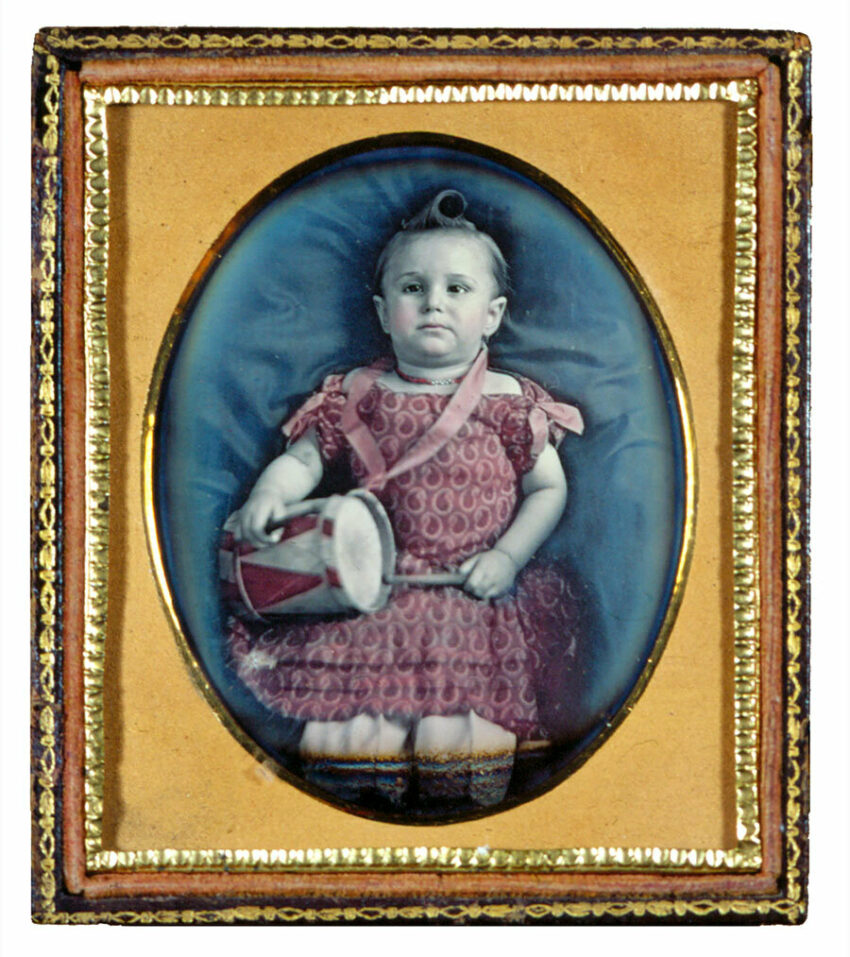 Sarah a. Lawrence has a toy drum hanging around her neck. A drumstick is nestled in each tiny hand. She wears a paisley dress and a beaded necklace; the strap on her drum is made of the same ribbon that decorates the puffed sleeves of her dress. The girl’s hair is styled into a single, coiffed curl atop her head. The image has been expertly tinted; her cheeks and lips are rosy, her dress is red and pink, the stripes on her drum crimson. But her open eyes don’t meet our gaze; her stare is unfocused and blank.