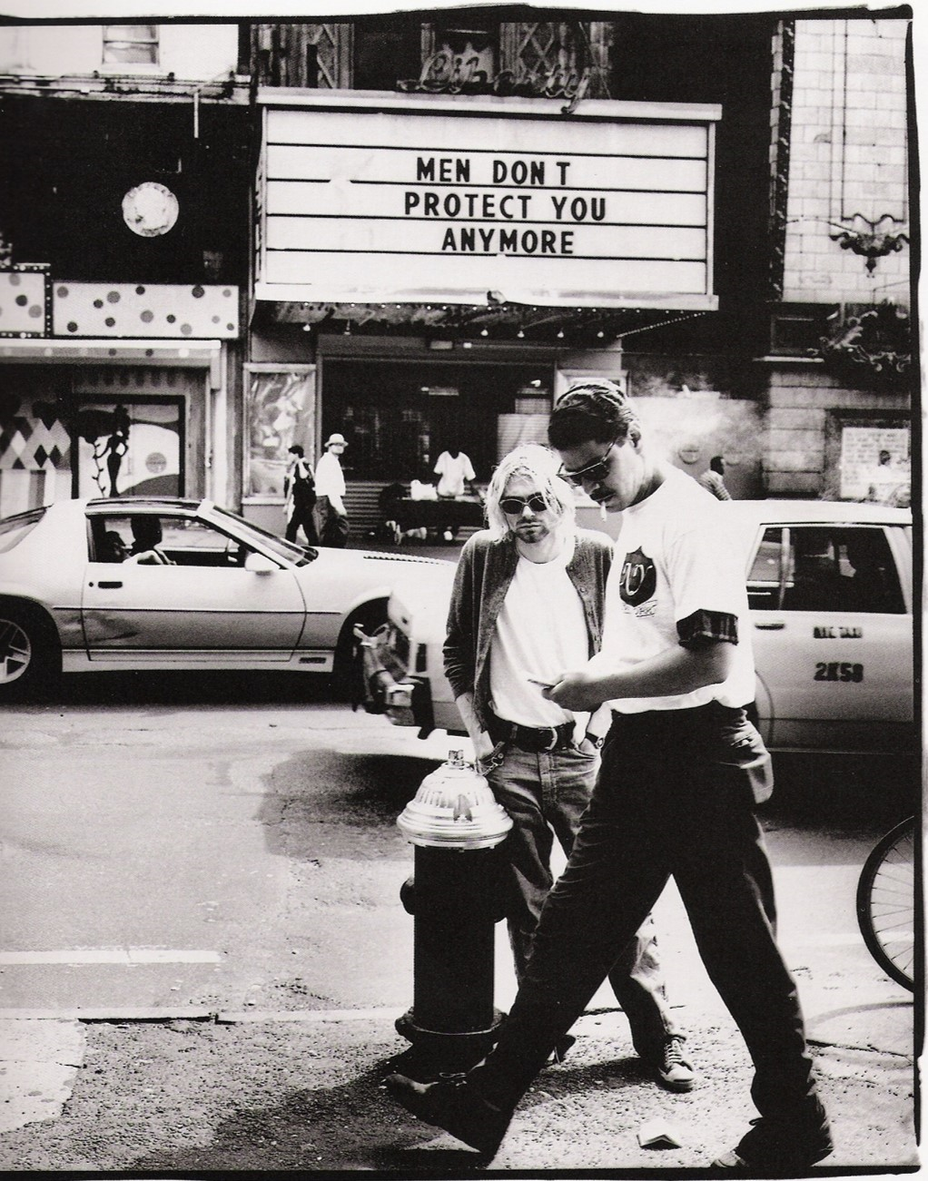 This picture of musician Kurt Cobain was taken on West 42nd Street in New York City on July 22, 1993 by Stephen Sweet, a photographer on assignment for the British music weekly Melody Maker. He was to photograph Nirvana, then one of the most successful bands in the world, and to take a portrait of Cobain alone; the magazine needed two or three cover options. According to Sweet, the pictures almost didn’t happen. Nirvana was to be scheduled to be shot by several photographers over the course of the day. He was fifth in line, but traded places with the photographer who was first and nervous because he didn't know where to pose the band. Sweet had seen unusual texts on the marquees of the condemned movie theaters along 42nd Street and thought they would make a good backdrop. Sweet didn't know it at the time, but these texts were by the artist Jenny Holzer, from her Survival series. (Holzer’s work Light Line is currently showing at the Guggenheim Museum, New York, a reinterpretation of an installation she made there in 1989.) He had responded to them and expected Cobain would too. As the photographer later recalled, when Cobain saw men don’t protect you anymore emblazoned on the marquee of the Liberty Theater, he said, “Take my picture in front of that.” Now, on the 30th anniversary of Cobain's death, this picture comes back into view.