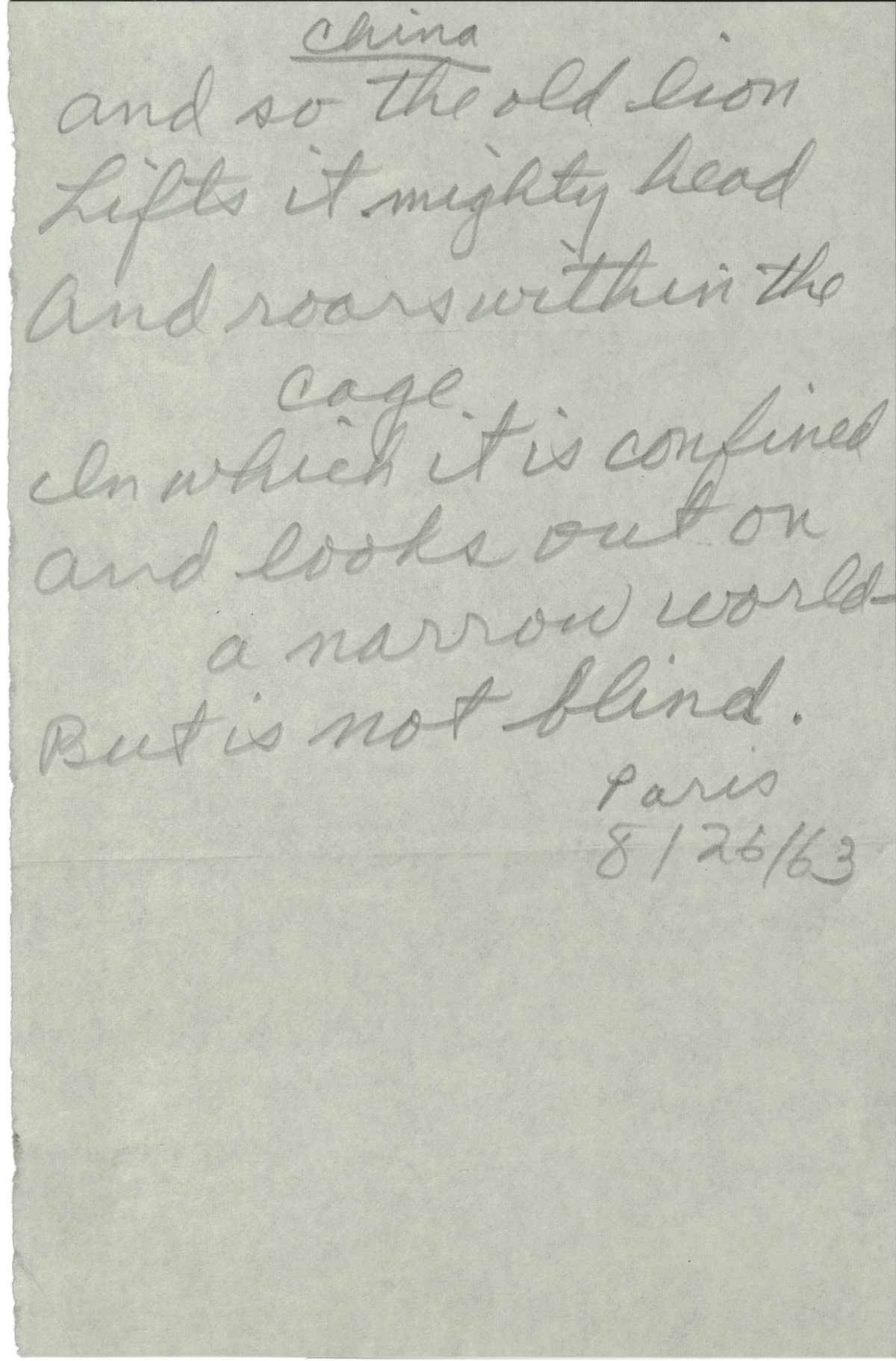 During the summer of 2019, I was wading through the Langston Hughes papers in the Beinecke Rare Book and Manuscript Library at Yale for a book I am writing on Afro-Asian encounters in the twentieth century. I was researching Hughes’s fascinating 1933 visit to interwar China and the impact that Hughes had on the country’s literary scene as the first black intellectual to set foot on Chinese soil. Hughes’s trip elevated African Americans in the Chinese cultural imagination. Among the most unexpected discoveries that I made in the archive was an unfamiliar poem by Hughes, which I soon realized had never been published. Titled “China,” the piece is made up of just six lines that the sixty-two-year-old poet scribbled on August 26, 1963, in Paris during a two-month tour of Europe.