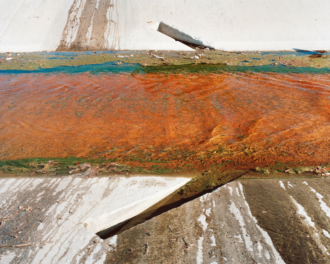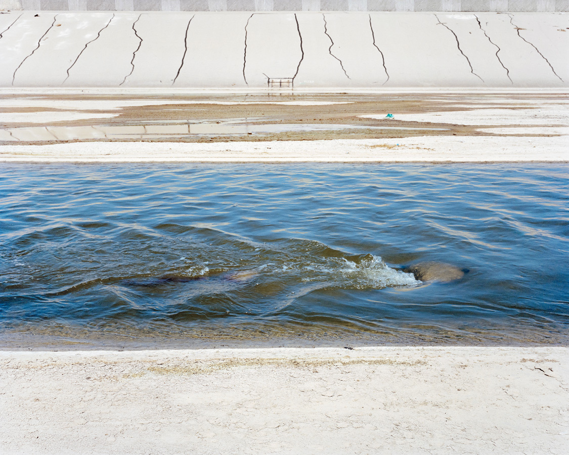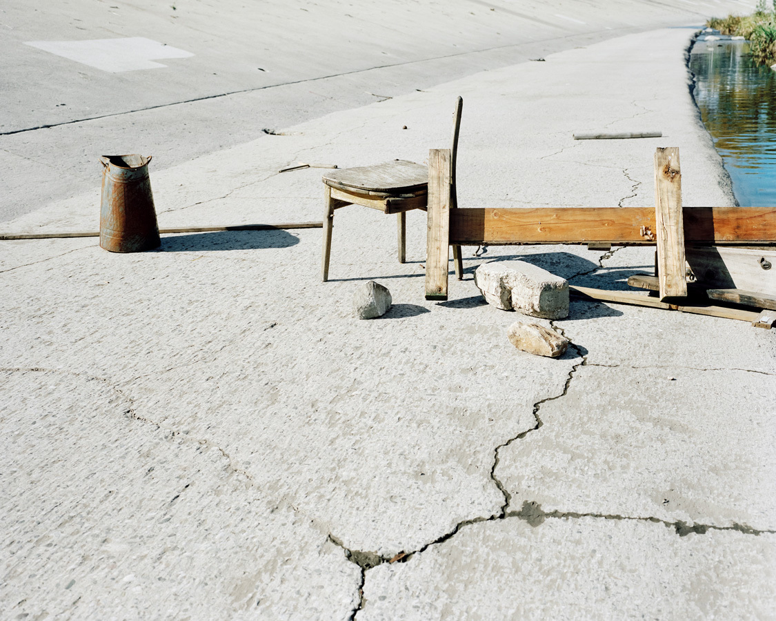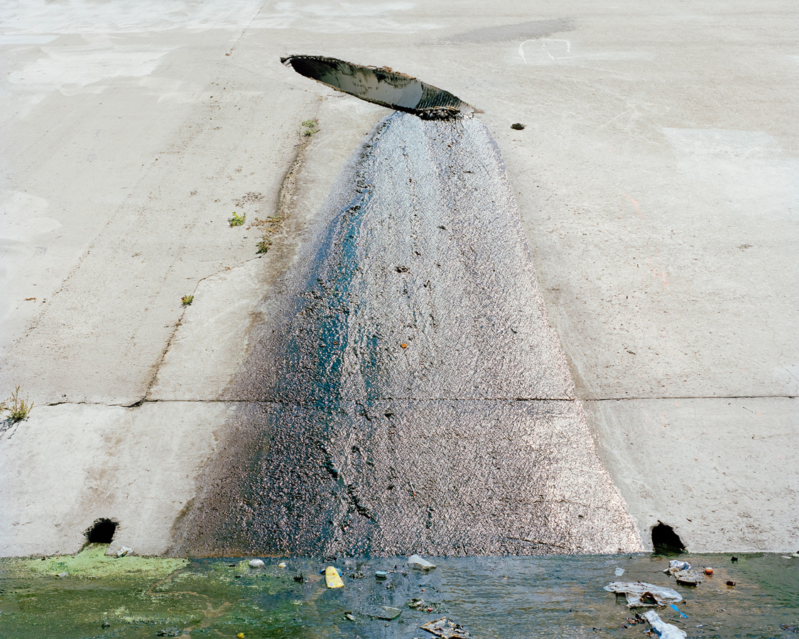 Channel, the project from which this folio is drawn, considers the site of the Los Angeles River, describing a place where nature has become preternatural. The natural river is a cyclical body of water, surging with snowmelt and late-winter rain, that forms in the San Fernando Valley. Its alluvial plain shaped the land over which Los Angeles now sprawls. Its counterpart is a concrete river built by engineers beginning in 1938 after a series of devastating floods. The flowing river is perennial and elemental, charting geological time. The constructed river is vulnerable and finite, a fossil of the future.