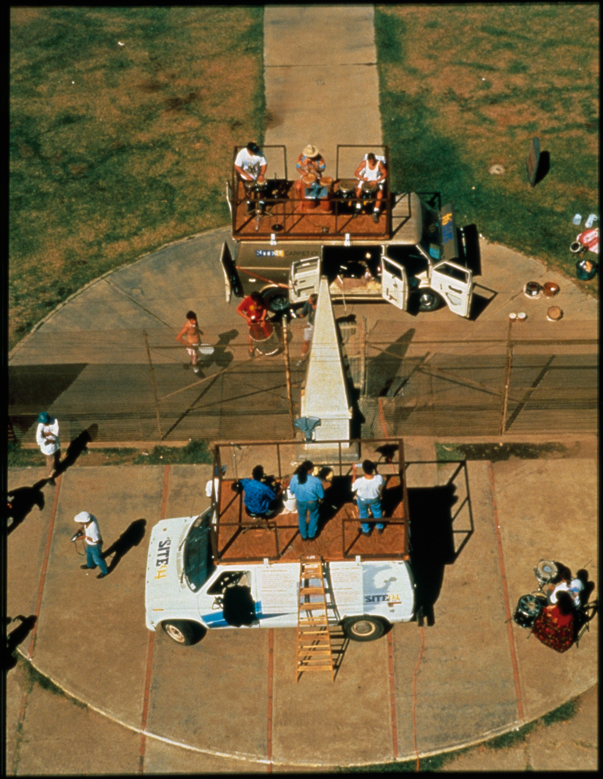 Almost exactly thirty years ago, on the post-equinox morning of Saturday, September 24, 1994, two dilapidated vans parked next to each other on either side of the US-Mexico border. One was in San Diego’s Border Field State Park and the other in Playas de Tijuana, each retrofitted with a ladder, a rooftop platform, a sound system, and a translator. Signs on each van encouraged public participants to climb onto the makeshift stages and express themselves freely “to/at/for the other side.” Separating the vehicles was a chain-link fence punctuated by a marble obelisk officially known as Border Monument No. 258, erected in 1851 to mark the national boundaries. One hundred and twenty years later, First Lady Pat Nixon inaugurated the surrounding site as International Friendship Park, celebrating the supposed fellowship between the United States and Mexico. (Today artist Terry Allen refers to this diminutive tower as the “ultimate irony prick.”) Along the chain-link demarcation, US soldiers were erecting, as part of President Clinton’s Operation Gatekeeper, a ten-foot-high border barrier constructed of corrugated steel sheets salvaged from Vietnam War-era landing mats, which resembled, to Allen, “big rusty razor blades—so symbolically hideous.”
