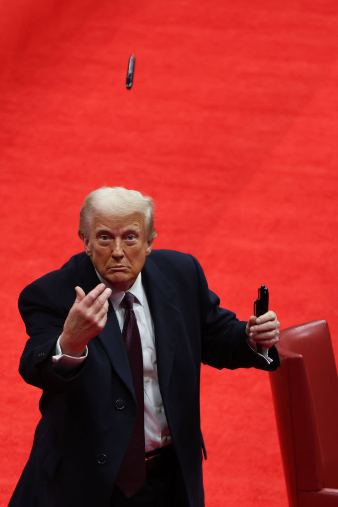 On January 20, after signing executive orders at the Capital One Arena, Trump tossed the used Sharpies to his followers, the way Elvis once tossed his sweat-soaked scarves into the crowds at his shows, writes James Surowiecki. Photo by Justin Sullivan / Getty Images